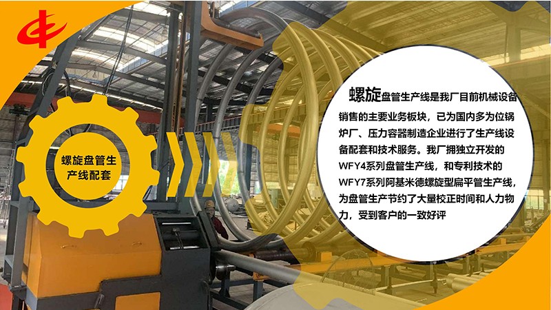螺旋盤管生產(chǎn)線是我廠目前機械設(shè)備銷售的主要業(yè)務板塊,已為國內(nèi)多為位鍋爐廠、壓力容器制造企業(yè)進行了生產(chǎn)線設(shè)備配套和技術(shù)服務。我廠擁獨立開發(fā)的WFY4系列盤管生產(chǎn)線,和擁有專利技術(shù)的WFY7系列阿基米德螺旋型扁平管生產(chǎn)線,為盤管生產(chǎn)節(jié)約了大量校正時間和人力物力,受到客戶的一致好評。